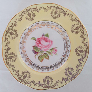 In addition to thus set of trios, I'm lucky enough to have two sets in yellow, a green set and another amazingly beautiful pink set. There are two yellow designs, the first has a yellow band on the inside of the teacups, on the tea plate is a beautiful pink rose.